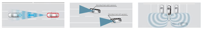 Dengan performa tinggi sensor kamera depan, SCBS mendeteksi kendaraan yang berada di depan mobil. Sistem secara otomatis akan melakukan pengereman untuk membantu menghindari tabrakan dan mengurangi kerusakan akibat tabrakan ketika berkendara dalam kecepatan sekitar 4 dan 30km/h (mendeteksi kendaraan di depan).